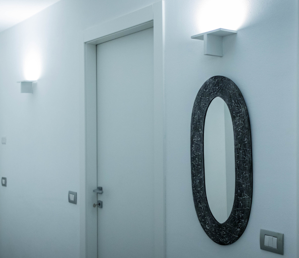 These wall lamps are designed in different colors, but in this case total white was chosen. The architect wanted the shape of this lamp to appear by difference of light, rather than in color, and the total white of the fixture, combined with that of the walls and roof, allowed this effect.